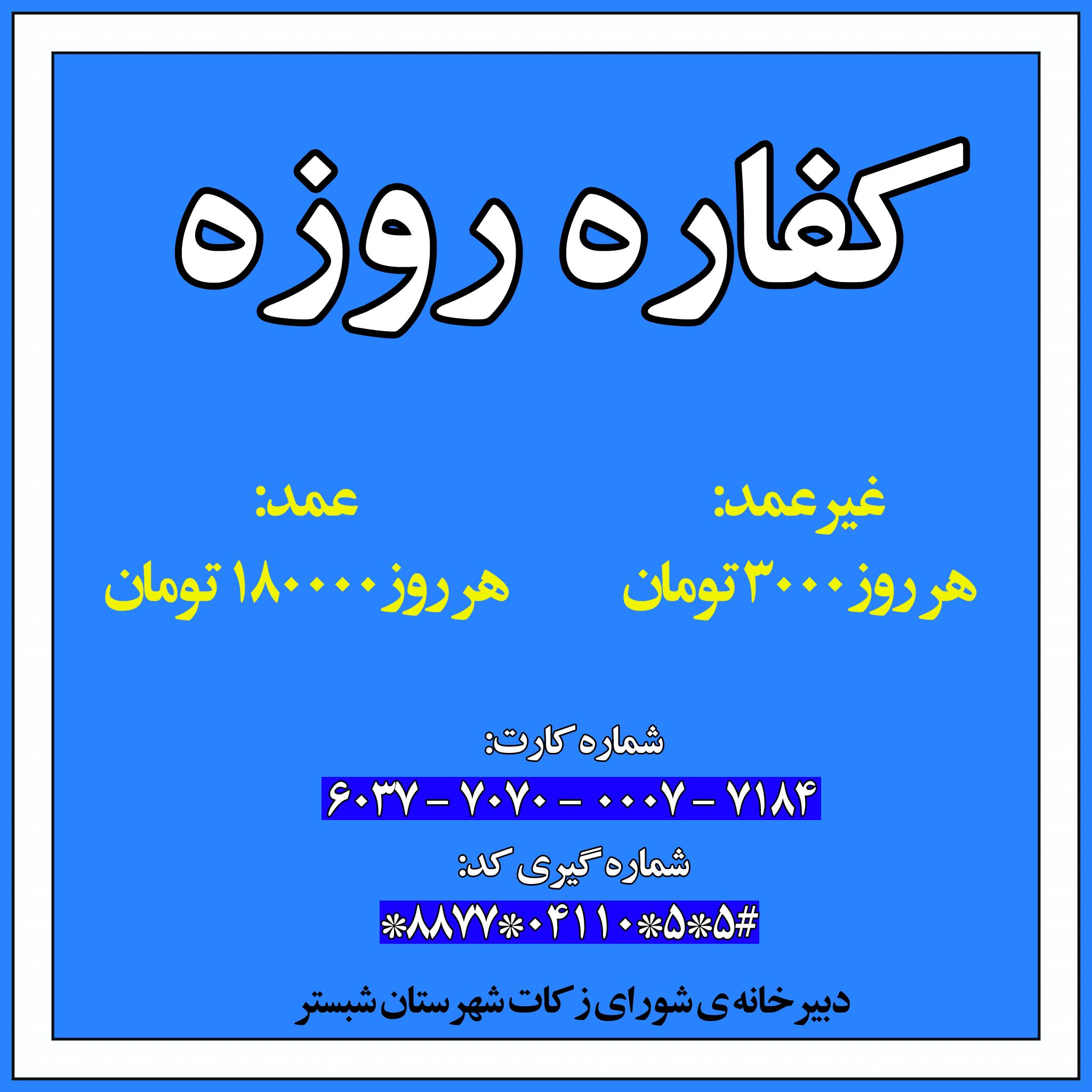 شورای زکات شبستر, بنر زکات فطره, مبلغ کفاره غیر عمد, بنر کفاره, کفاره جمع, نحوه محاسبه کفاره, قیمت کفاره روزه, محل پرداخت کفاره روزه