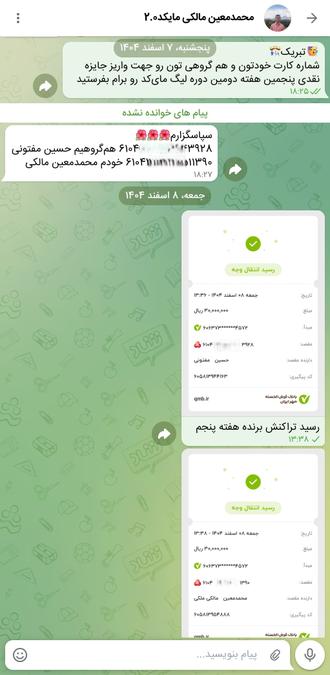 رسید تراکنشی پرداخت نقدی تیم برنده هفته پنج لیگ