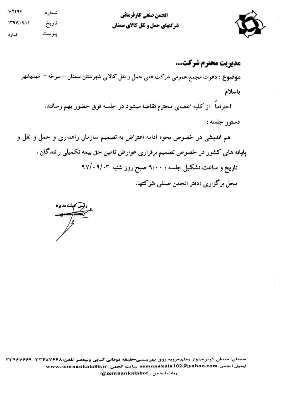دعوت به مجمع عمومی شرکتهای حمل ونقل کالای شهرستان سمنان - سرخه ومهدیشهر درخصوص اعتراض به نحوه محاسبه نحوه بیمه تکمیلی رانندگان.jpg